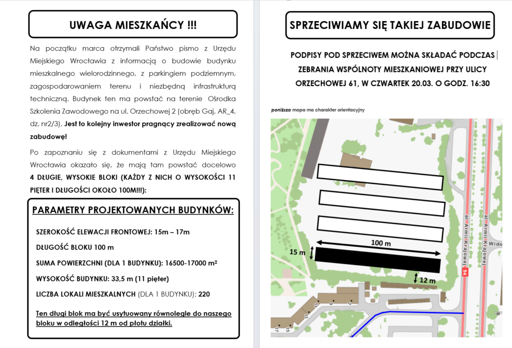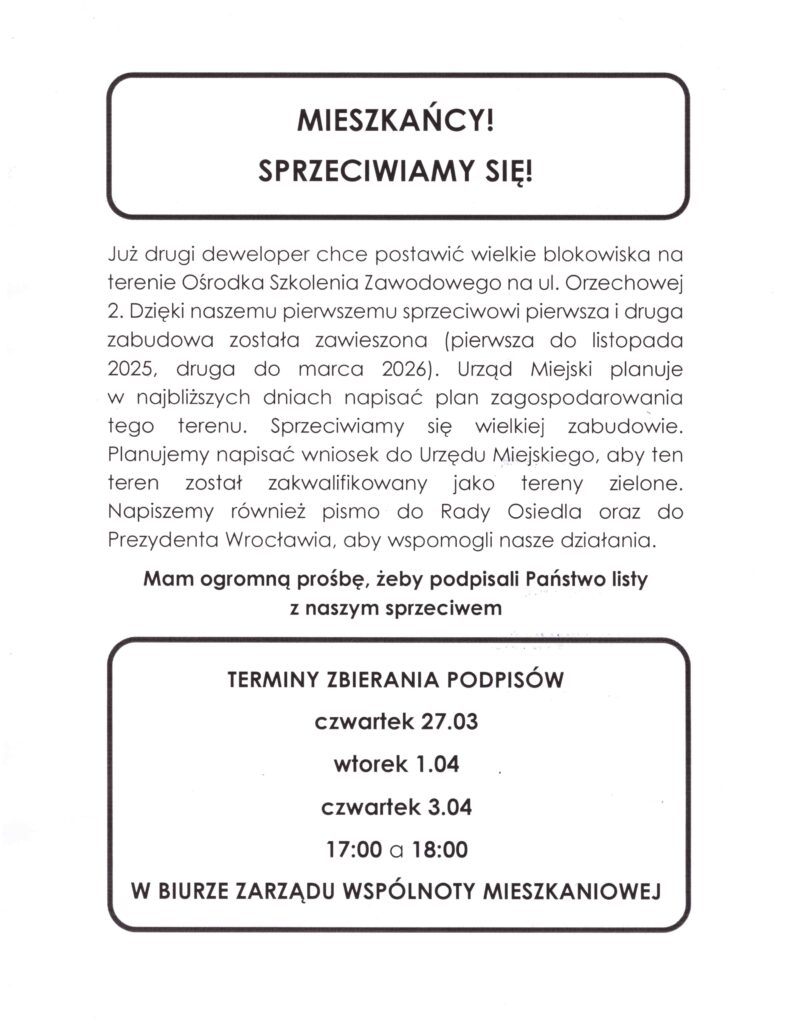Jednocześnie informujemy, że w dniach 17.09.2024r. oraz 19.09.2024r. podczas dyżurów zarządu wspólnoty będzie możliwość złożenia podpisów pod sprzeciwem przeciwko budowie (dotyczy to wyłącznie mieszkańców, którzy jeszcze nie podpisywali tego dokumentu).